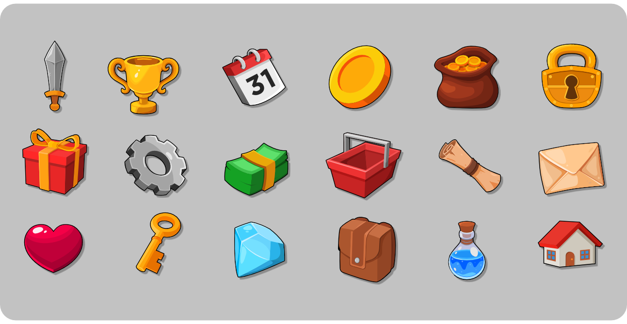 This icon pack contains a variety of commonly used icons. 18 different icons in both SVG and (256x256) PNG format.